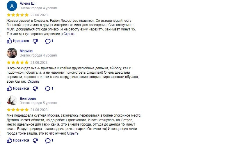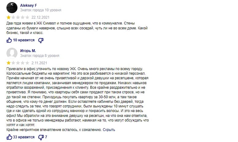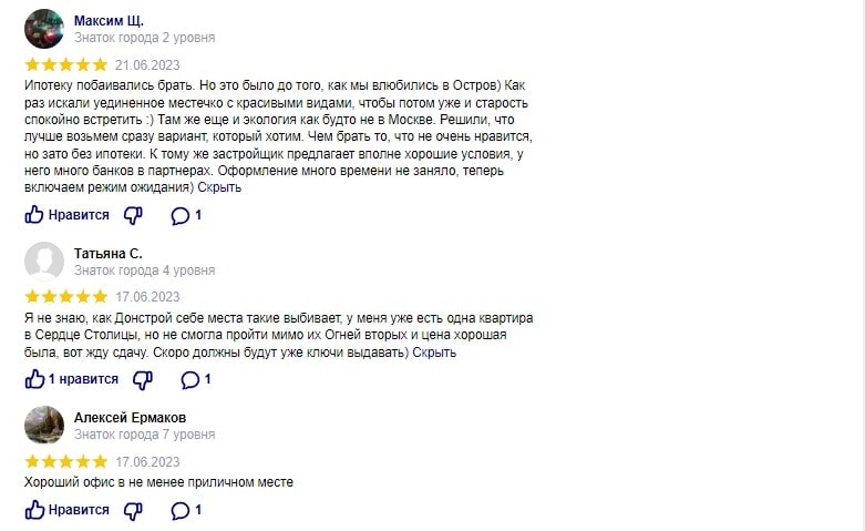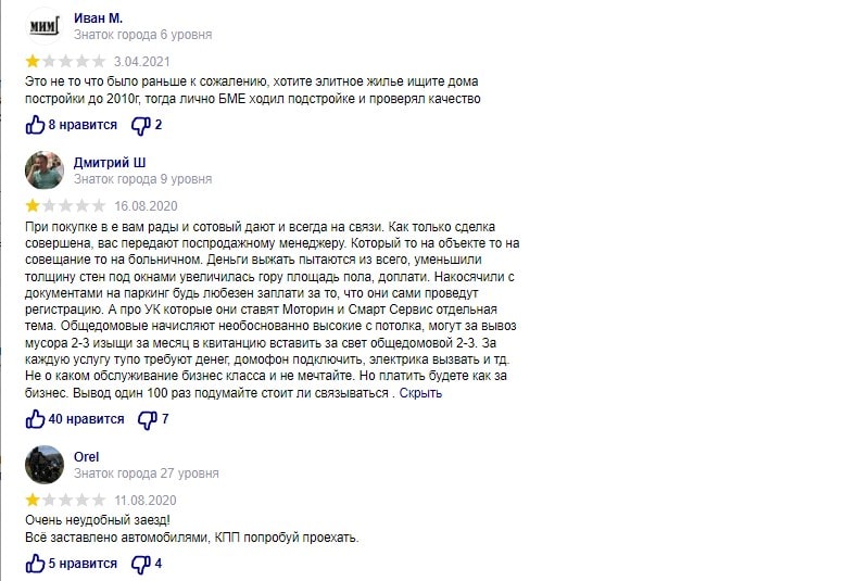Отзывы от дольщиков традиционно разделяются на 2 лагеря, что удивительно, ведь застройщик занимается исключительно элитным жильем.