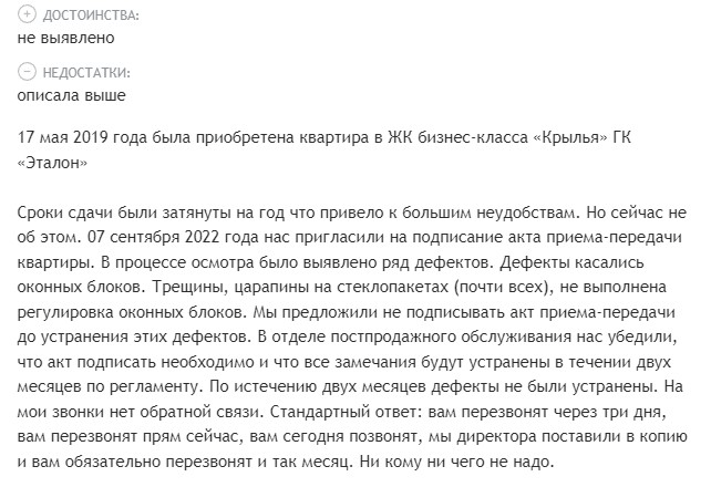 В интернете можно найти самые разные отзывы: как положительные, так и отрицательные. Одни хвалят девелопера за скорость и качество работы, отсутствие дефектов. Другие жалуются на задержку сдачи дома, нарушение договора и высокий прайс.